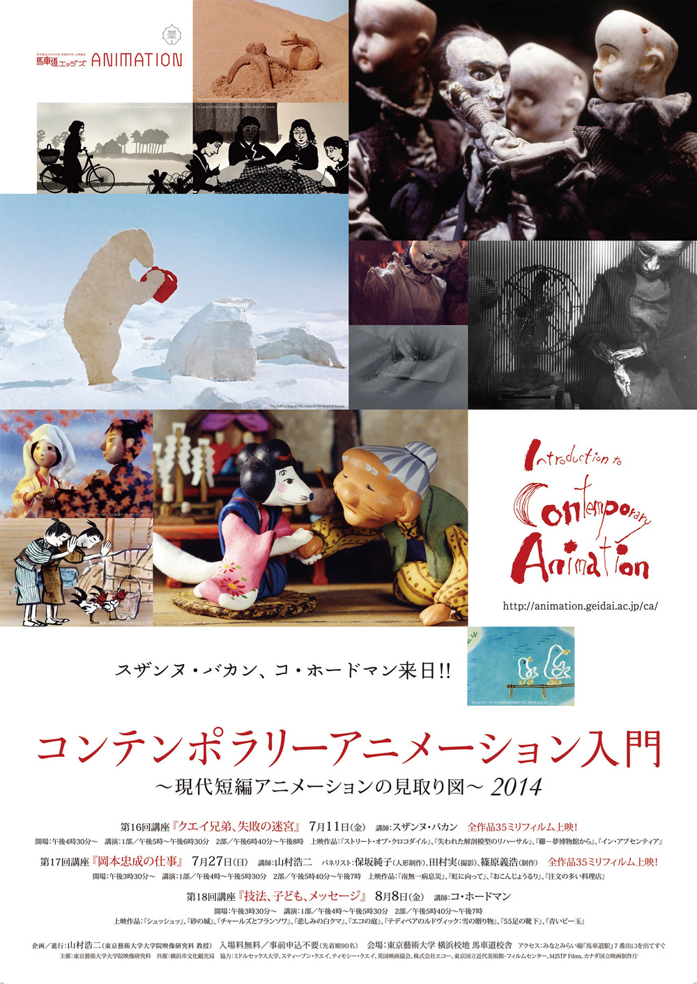 2009年7月に始まった公開講座「コンテンポラリーアニメーション入門」では、今年東京藝術大学の招聘で、現在イギリスで国際映画祭や美術館・放送等のキューレター、コンサルタントとしても活動しつつ、アニメーション美学を教授しているスザンヌ・バカン氏、岡本忠成が設立しアニメーションの可能性を広げる様々な傑作を生み出してきたエコーの当時の制作スタッフ、そして立体アニメーションを中心に実験的なアニメーションや子ども向けの良質な作品を多数生み出し続けているコ・ホードマン監督をお招きし、特別講座を開催します。