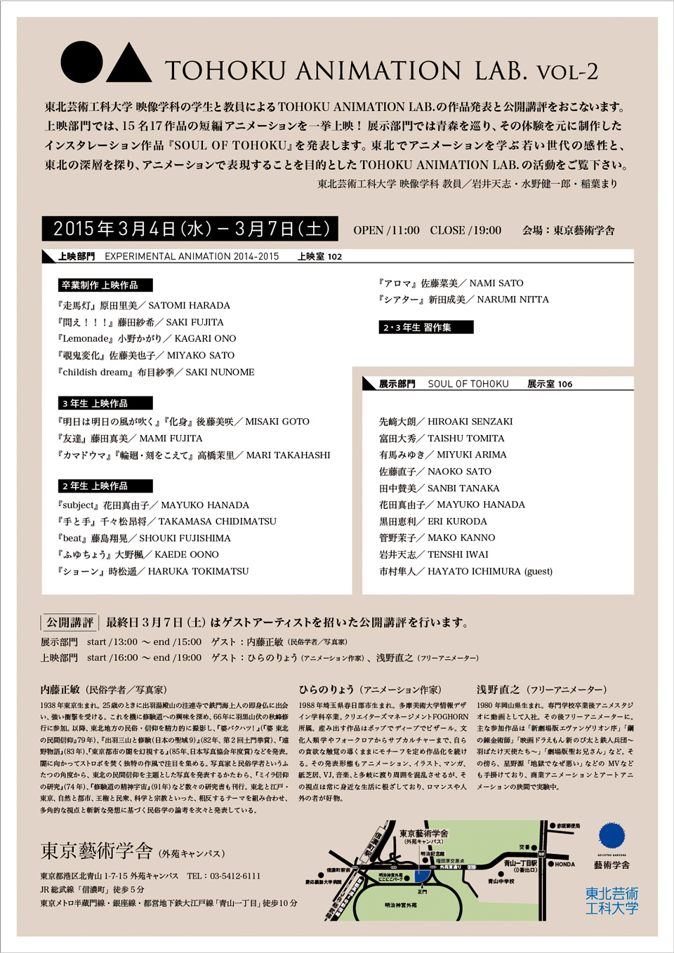 東北芸術工科大学 映像学科(山形県山形市)の学生と教員によるTOHOKU ANIMATION LAB.の作品発表と公開講評「TOHOKU ANIMATION LAB. VOL-2」が東京藝術学舍(外苑キャンパス)にて明日3月4日(水)から行われます。