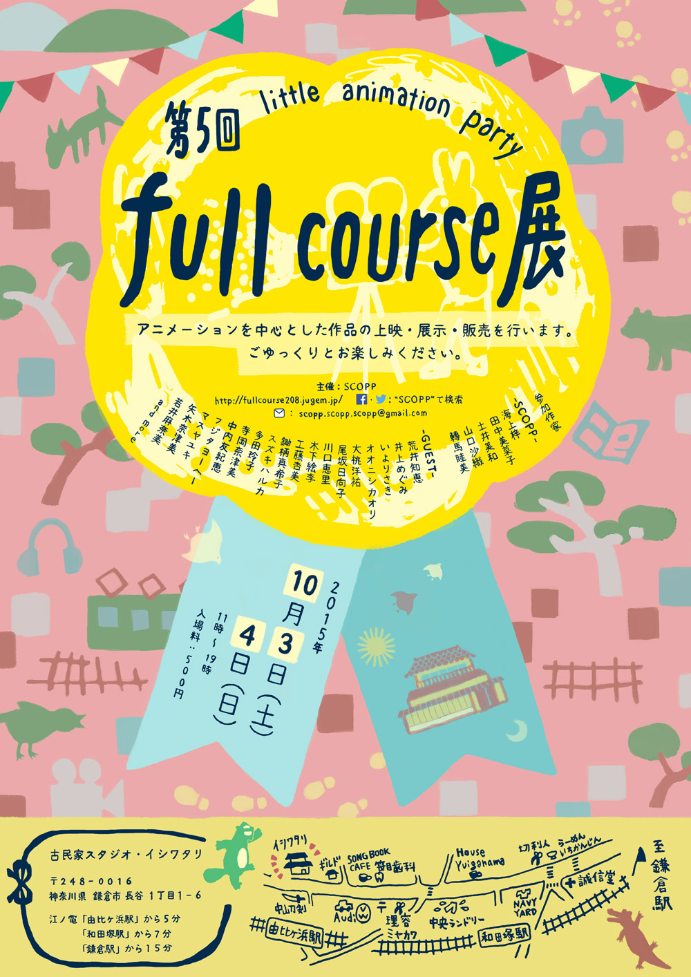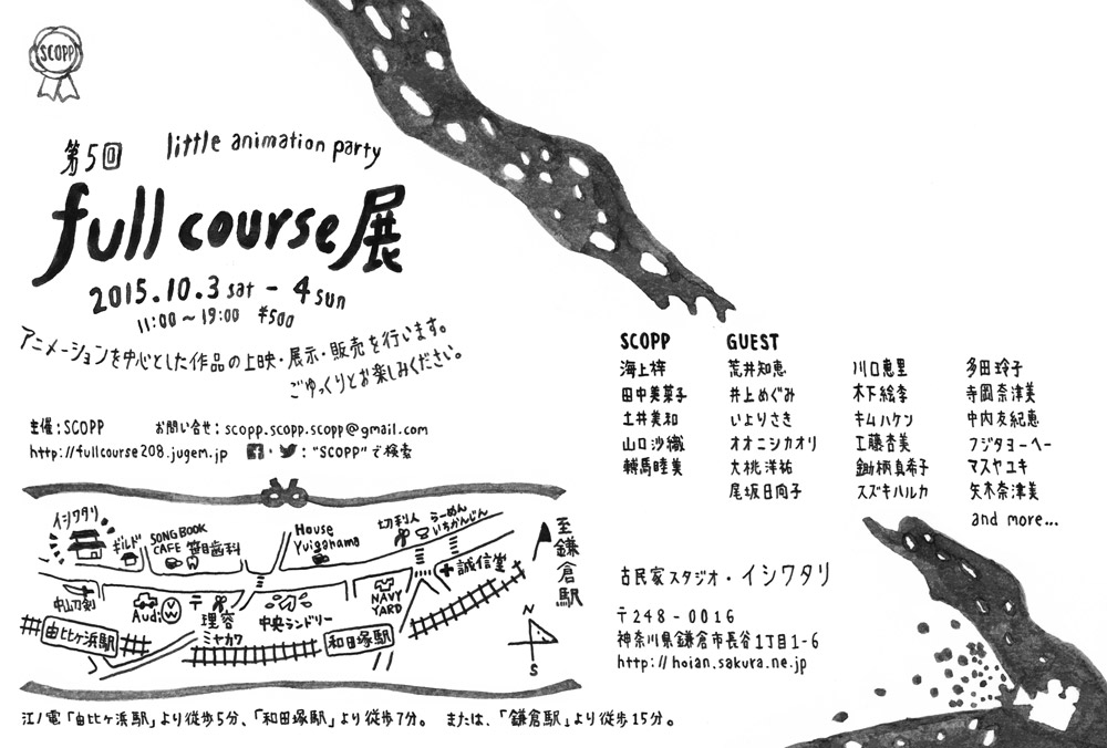 毎年日本のどこかで開催される「full course展」、第5回となる今回は、ベテランアニメーション作家 荒井知恵さんをはじめ、若井麻奈美さん、キムハケンさん、鋤柄真希子さん、いよりさきさんほかたくさんのゲスト(アニメーション作家・イラストレーター)が参加する、アニメーションを中心とした作品の上映・展示、そして各作家のオリジナルグッズ販売を行うイベントとなるようです。