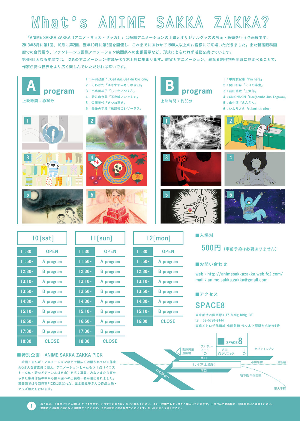 若井麻奈美さん・中内友紀恵さん・いよりさきさんが主催するアニメーション作家の合同企画展「第4回 ANIME SAKKA ZAKKA」が、今週末10月10日(土)からの3連休に、代々木上原にあるギャラリーSPACE8で開催されます。